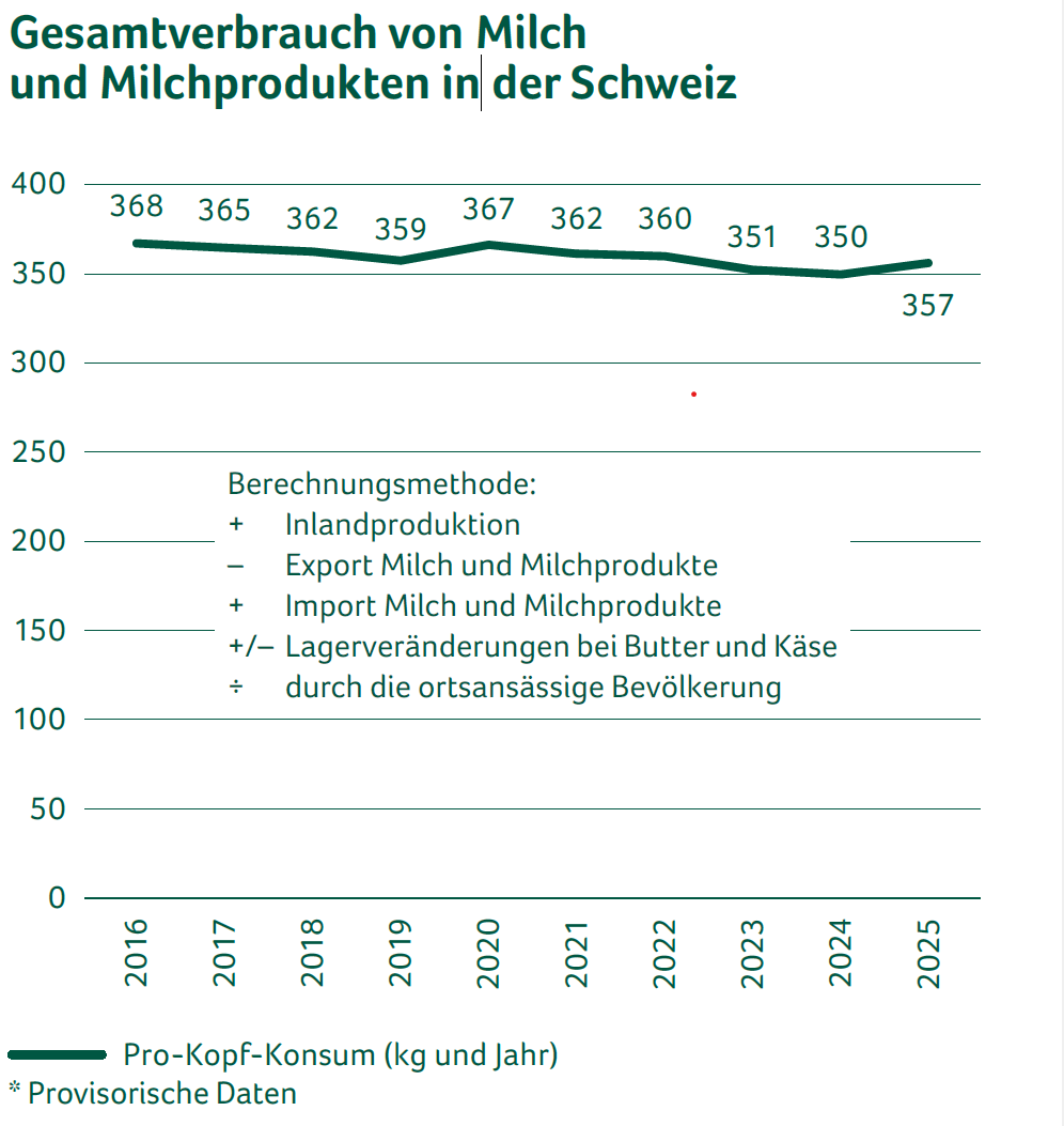 Längerfristig gesehen ist der Konsum von klassischer Konsummilch in den letzten 10 Jahren um etwa 15 Prozent gesunken. Dies zeigen die Zahlen von Agristat. Wir trinken etwa 17 Liter weniger Milch pro Jahr, im Vergleich zu 2014.