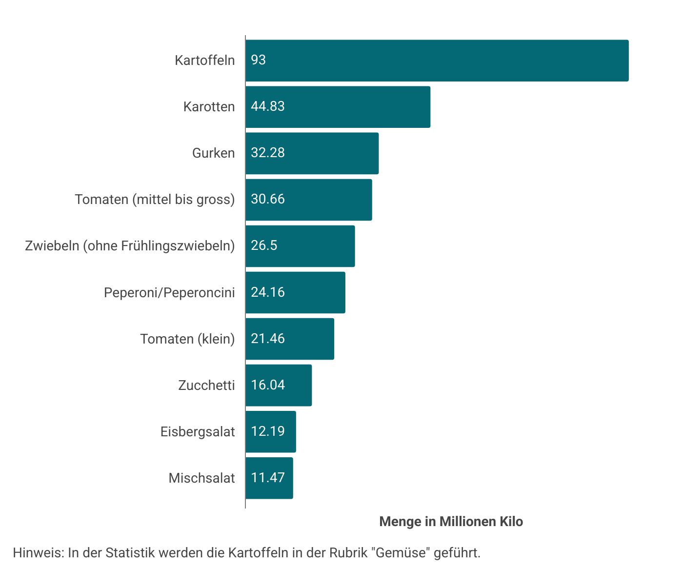 Insgesamt wurden in diesem Bereich 463 Millionen Kilo über den Detailhandel verkauft, davon 93 Millionen Kilo Kartoffeln, 3% mehr als im Jahr zuvor. Meistverkauftes Gemüse waren die Karotten mit 44,83 Millionen Kilo, gefolgt von Gurken und mittleren und grossen Tomaten. Würde man auch die kleinen Tomaten hinzuzählen, nähmen die Tomaten allerdings den Spitzenplatz ein.