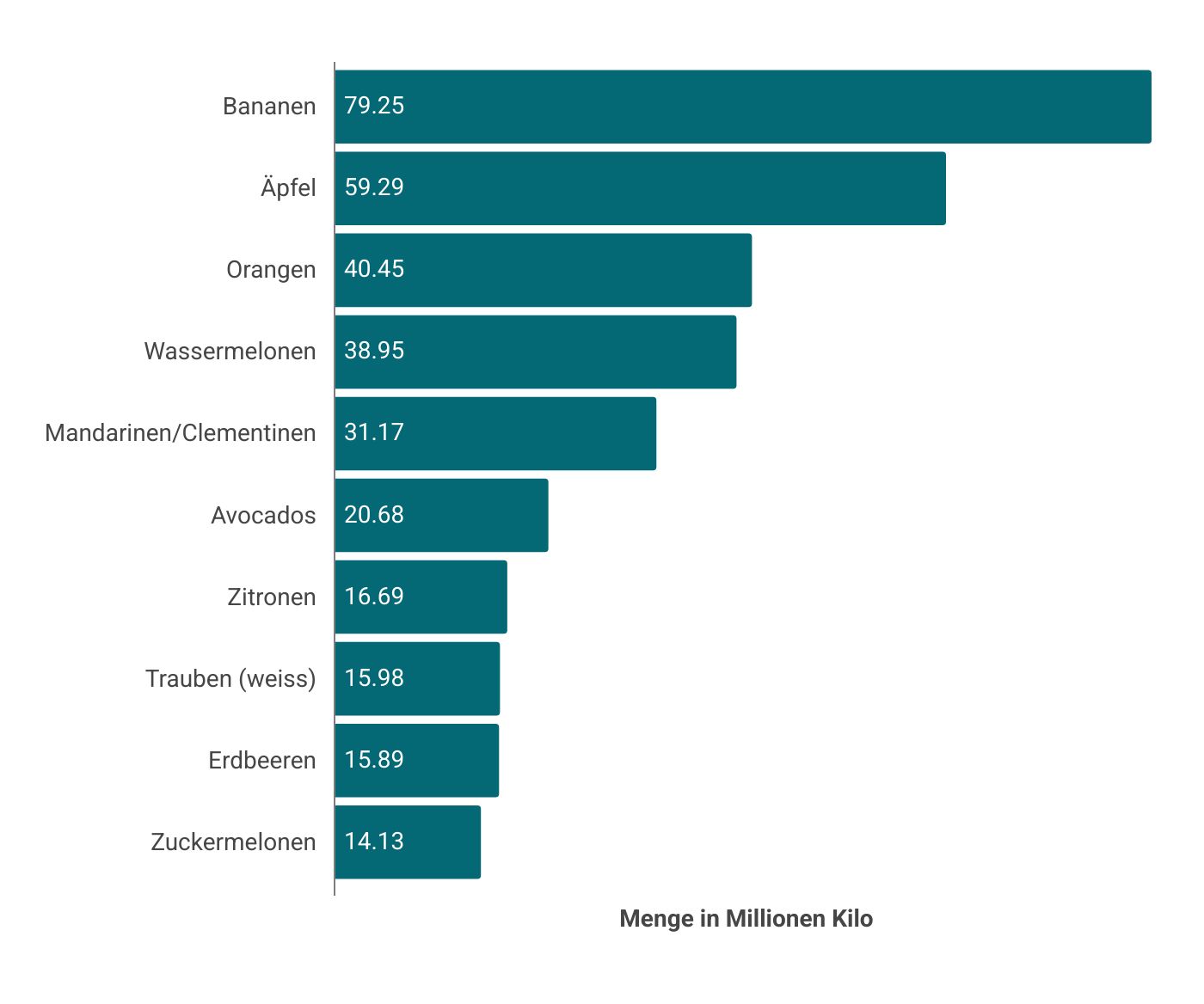 Zuoberst auf dem Treppchen bei den Früchten steht mit Abstand die Banane. Über 79 Millionen Kilo davon setzte der Schweizer Detailhandel 2025 ab. Auf den nächsten Rängen kommen Äpfel und Orangen, gefolgt von Wassermelonen, Mandarinen/Clementinen sowie Avocados. Insgesamt gingen 460 Millionen Kilo Früchte über den Ladentisch.