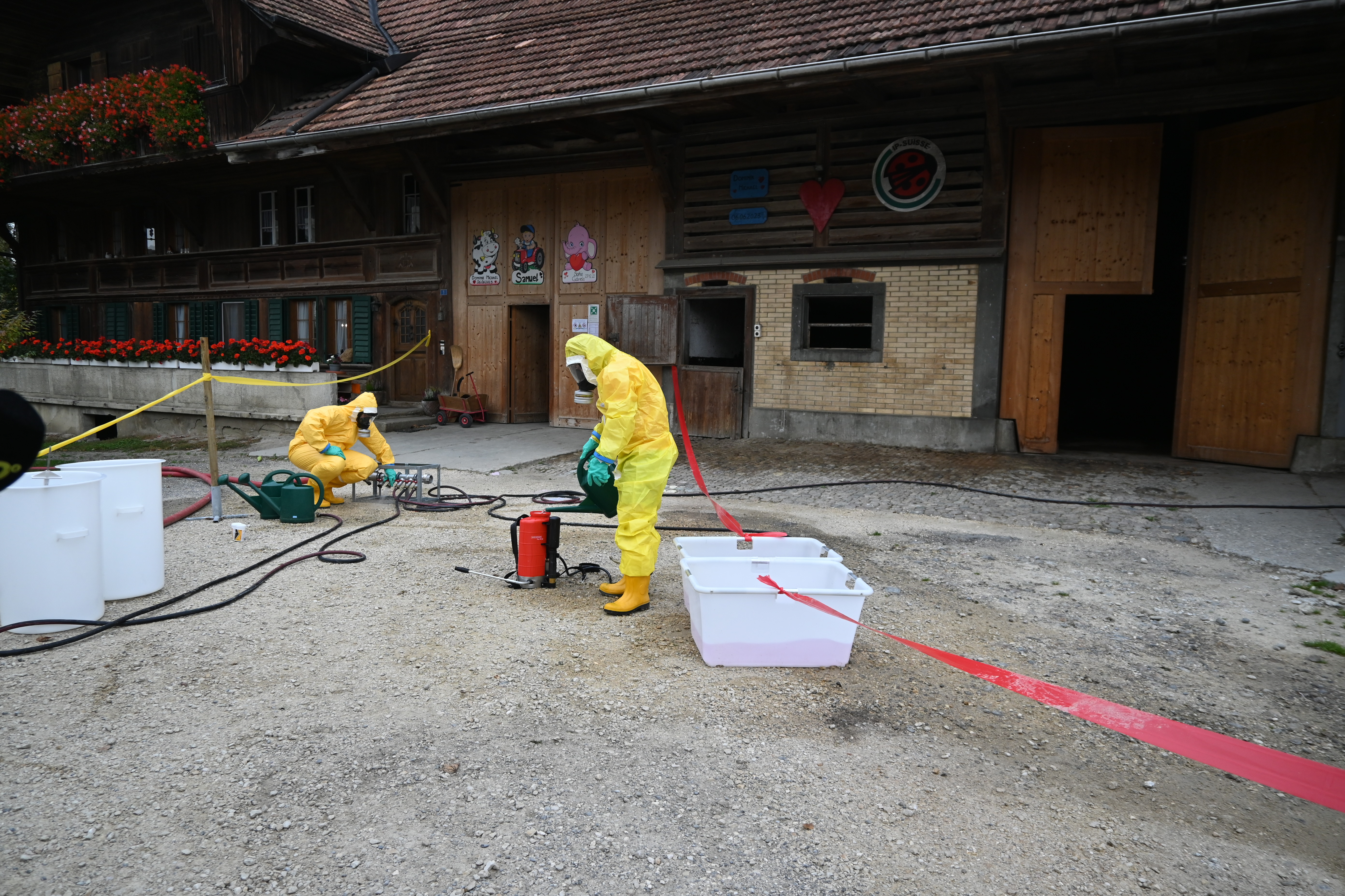 Der Dorfplatz in Mülchi im Kanton Bern ist abgeriegelt. Rund um einen Bauernhof sind gelbe und rote Absperrbänder gespannt. Personen in gelben Schutzanzügen mit Mundschutz oder Atemschutzmasken arbeiten im Stall oder auf dem Vorplatz. Sie kleben Fenster ab, rollen Schläuche aus.