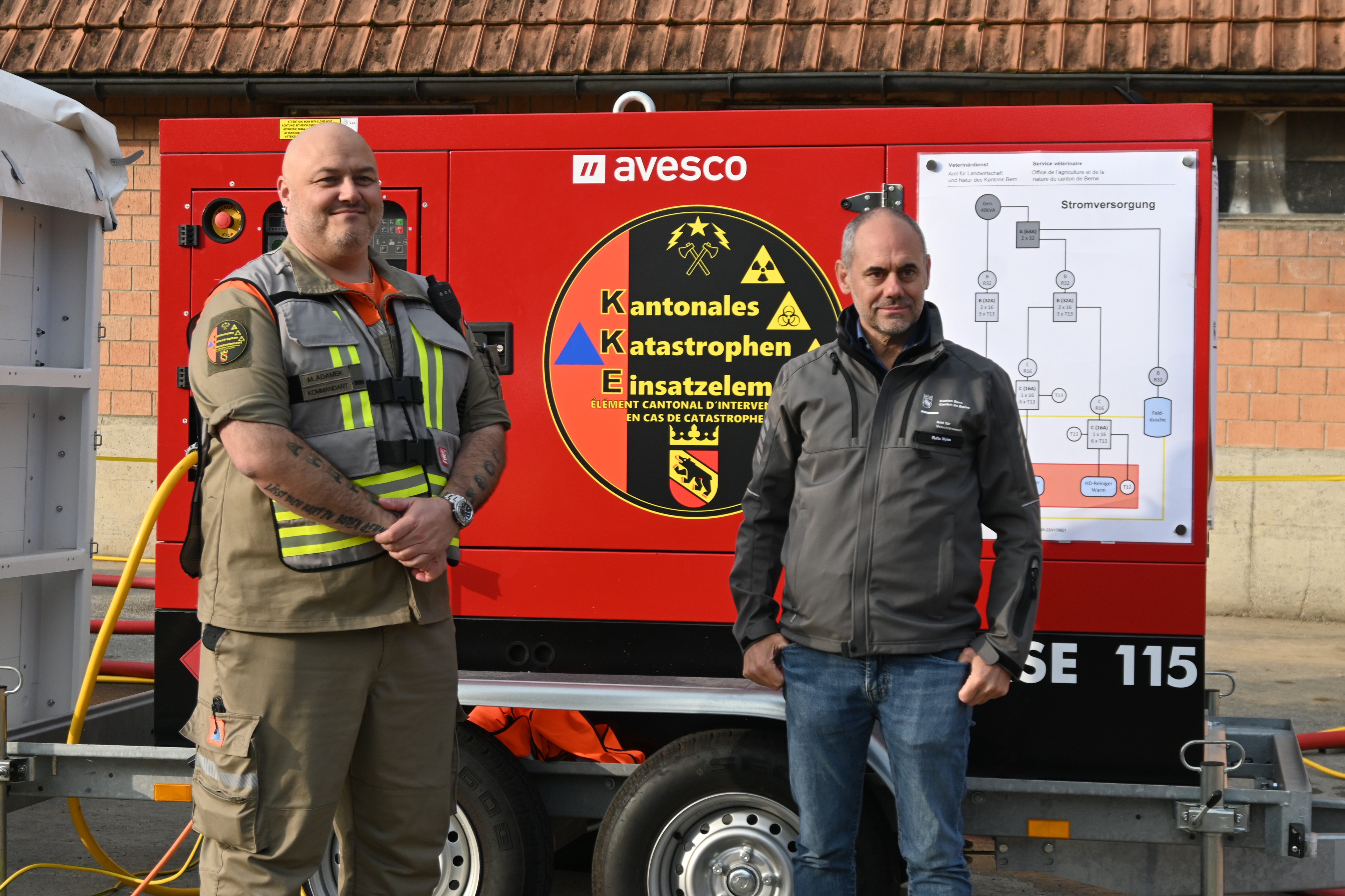Auf Platz sind auch Tierärzte des Amts für Veterinärwesen, ein Lastwagen mit einem Container von der GZM sowie die Kommandozentrale des Kantonalen Katastrophen Einsatzelement Bern (KKE).