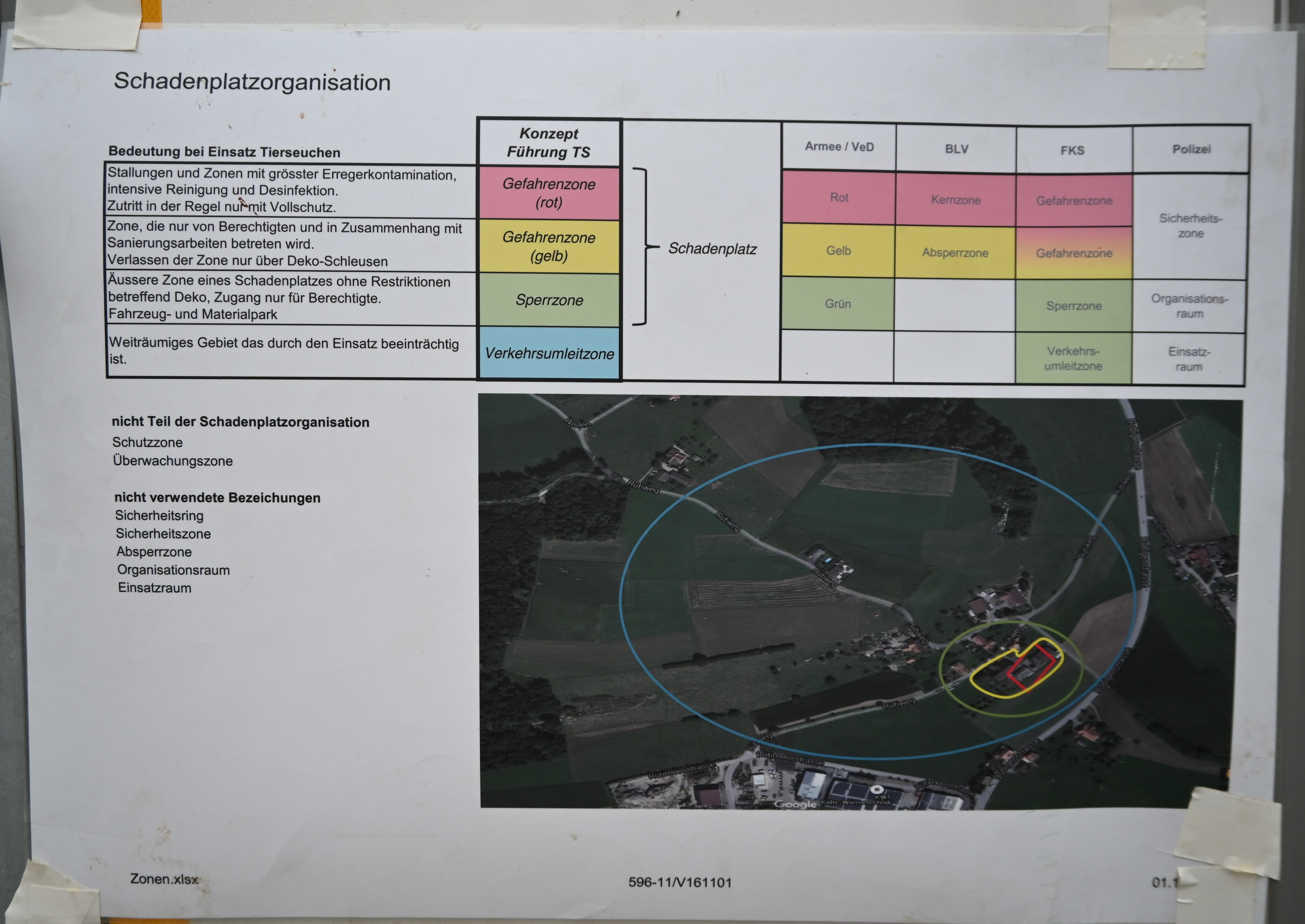 Als erstes errichten die Einsatzkräfte eine grossräumige Schutzzone rund um den betroffenen Betrieb. Der Betrieb wird gesperrt: Es dürfen keine Tiere den Betrieb verlassen und auch Personen nur unter Einhaltung strenger Sicherheitsmassnahmen. Die innerste Zone ist die rote Zone, dazu gehören der Stall und auch der Mistplatz. Alle Materialien und Personen, die dort zum Einsatz kommen, müssen die Zivilschützer wieder reinigen und desinfizieren.