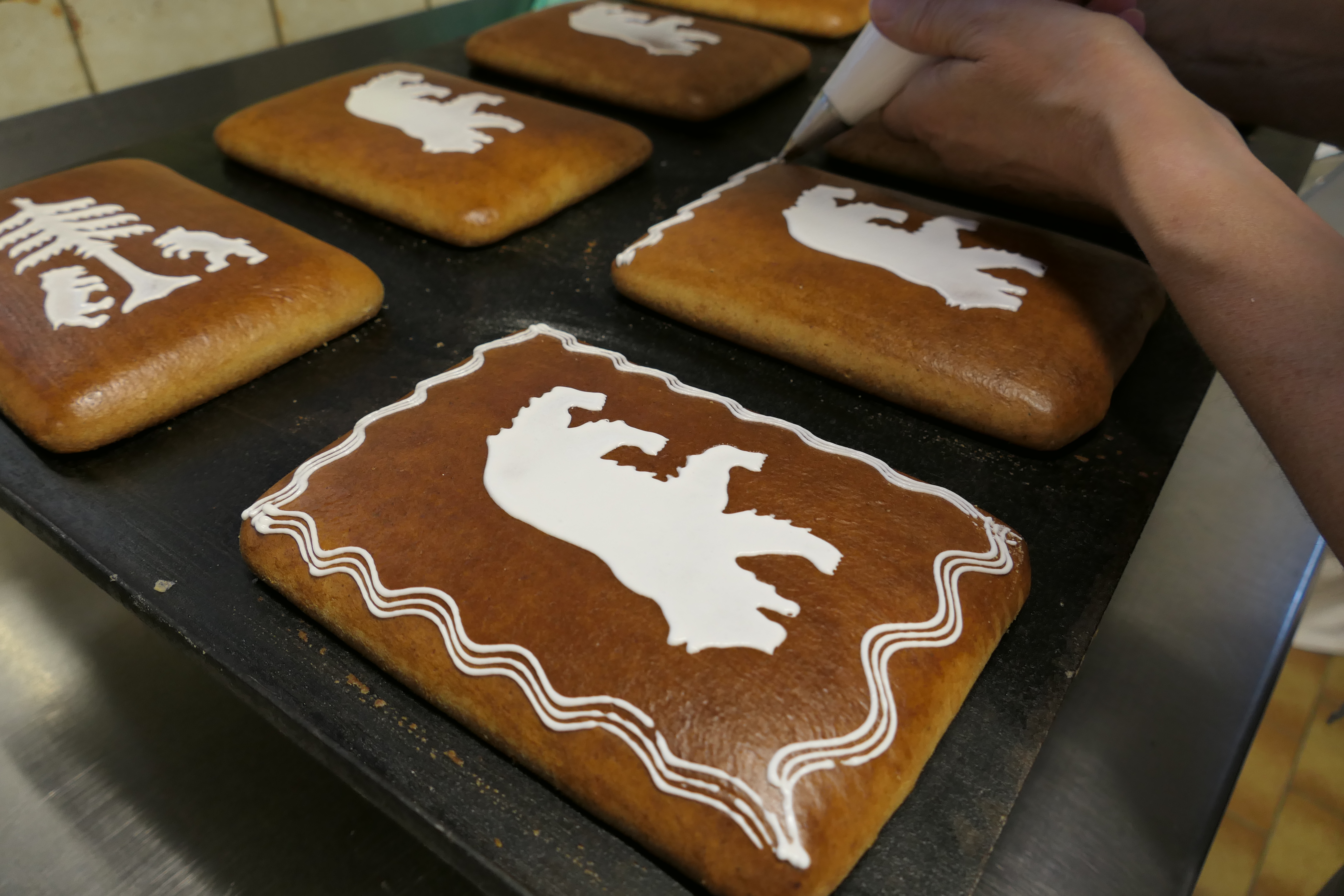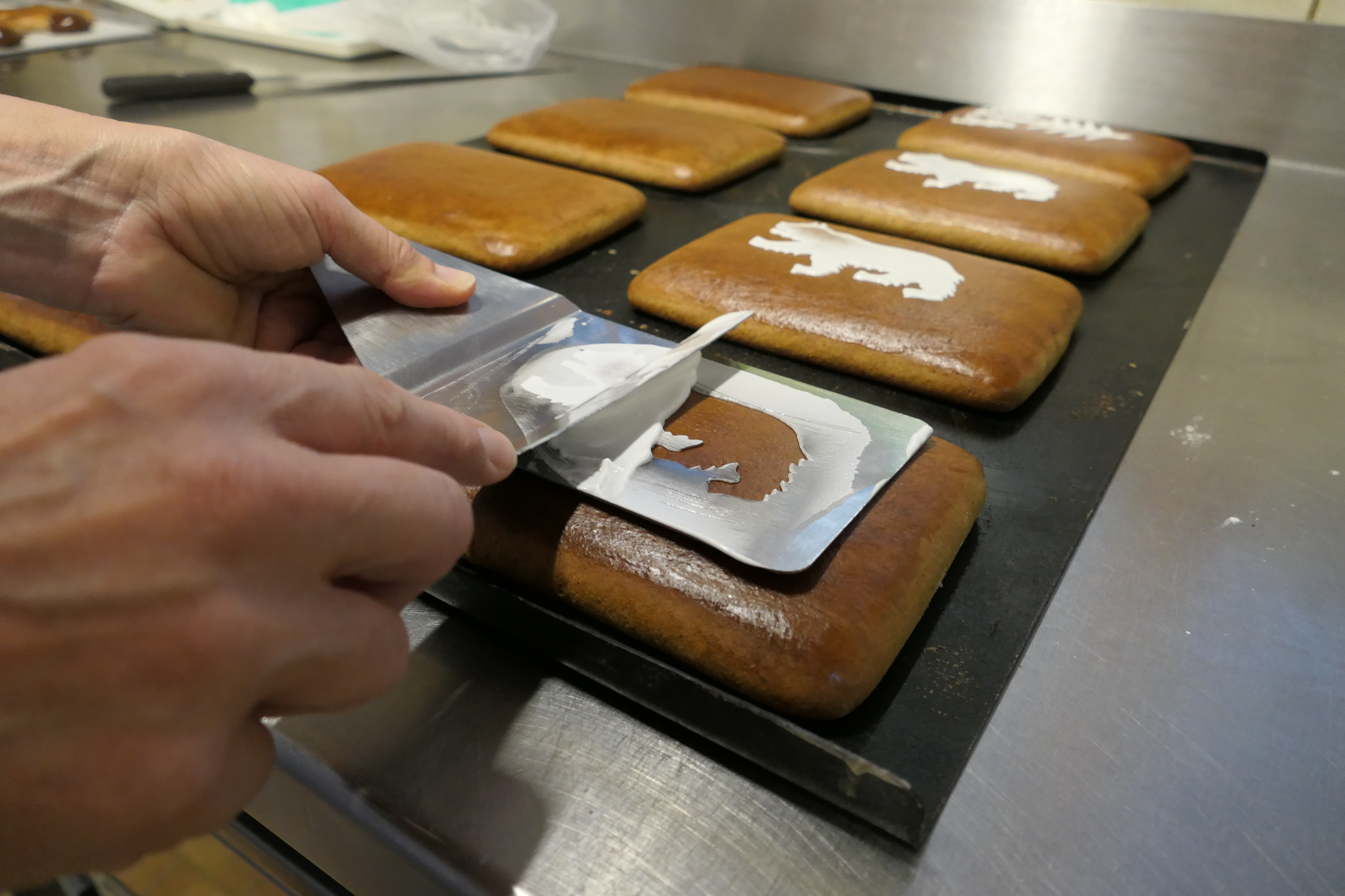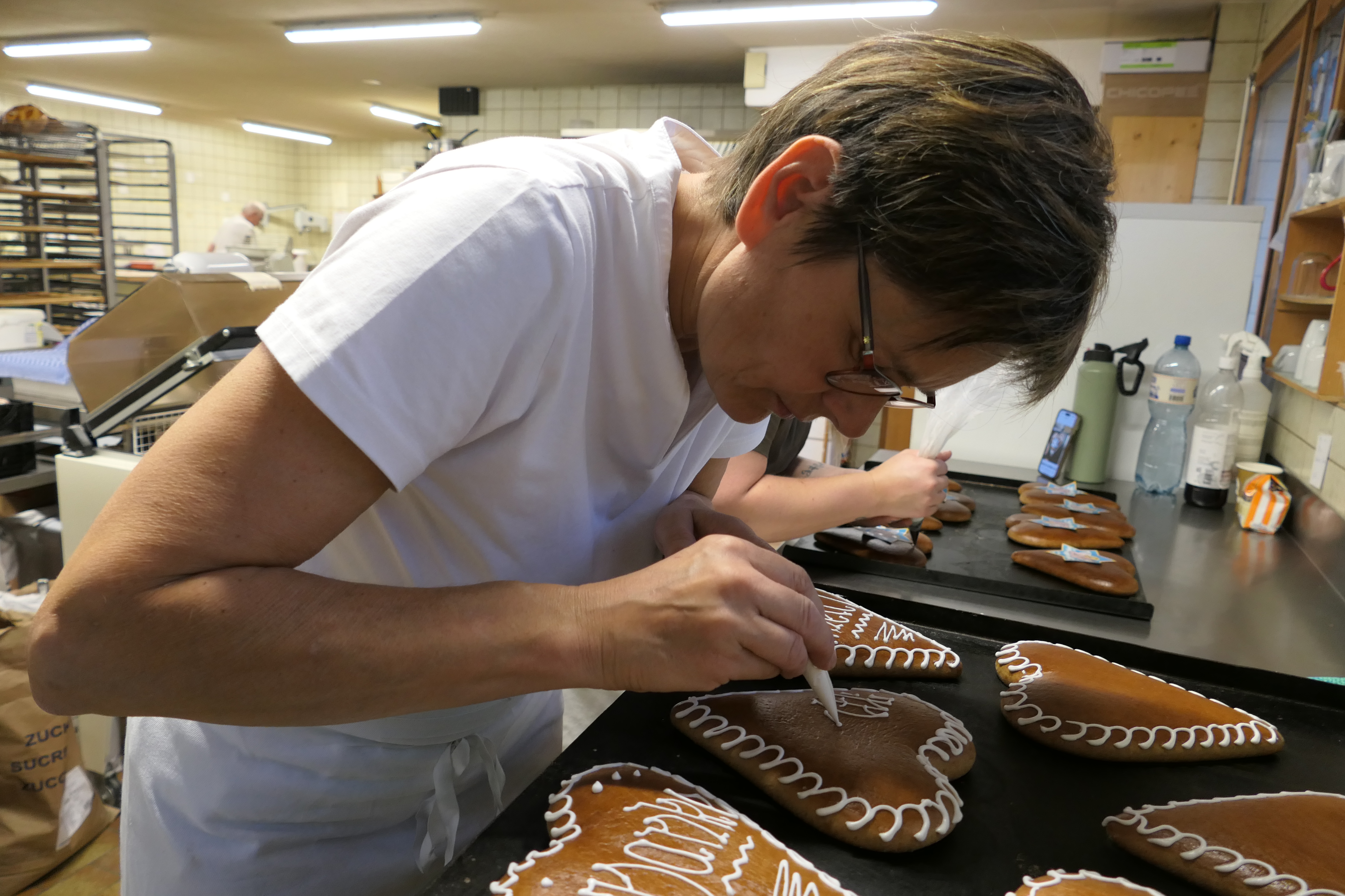 Die ungefüllten Lebkuchen werden von Hand dekoriert. Eine Arbeit für Nicole Rauber: «Ich mache das sehr gerne – die Grundlage ist immer ein Lebkuchen, doch die Dekoration ist so vielseitig und kreativ», strahlt die Frau, welche die Lehre bei Michel Buchs gemacht hat. Mit ruhiger Hand personalisiert sie Lebkuchen oder verleiht dem Bild vom Jauner Samichlaus einen Dekorahmen mit verschlungenen Verzierungen und Dreifachlinien. Die Zuckerglasur stellt sie portionenweise her, damit diese flüssig bleibt. Dass sie dafür frisches Eiweiss und kein Pulver verwendet, ist für die Bäckerei selbstverständlich.