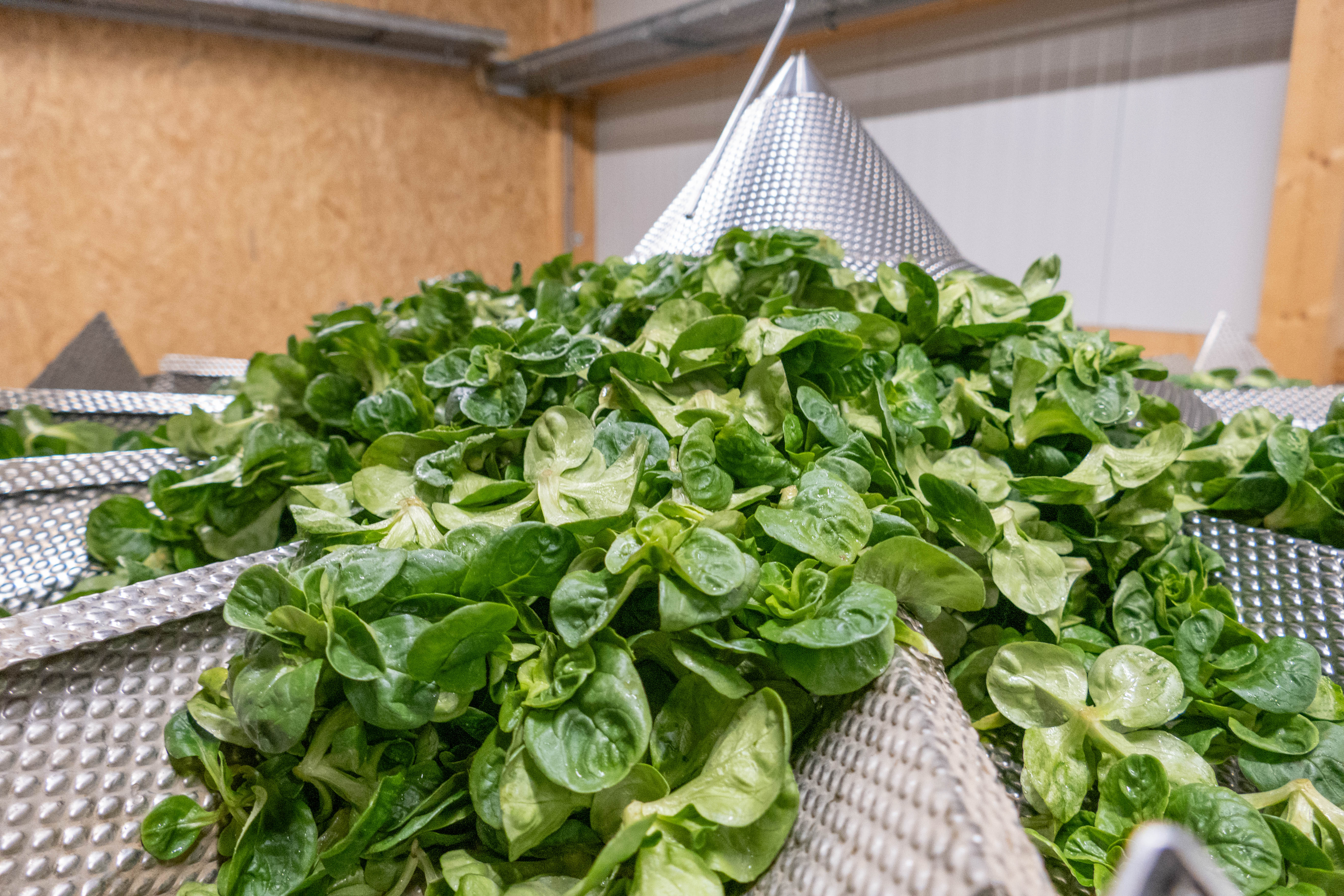 Die Kisten mit dem geernteten Nüsslisalat kommen zuerst für zwei Tage in den Kühlraum. Denn die Rosetten müssten sich erst einmal erholen, erklärt Thomas Käser. Die Ernte bedeute für den Nüsslisalat puren Stress: «Beim Auftauen fliesst der Pflanzensaft abrupt in den oberen Bereich und dann wird er mit einem scharfen Messer geschnitten.» Das alles muss die Pflanze erst einmal verkraften. Es habe sich gezeigt, dass der Nüsslisalat nach der Ruhepause besser aussehe. Gut Ding will offenbar auch hier Weile haben.