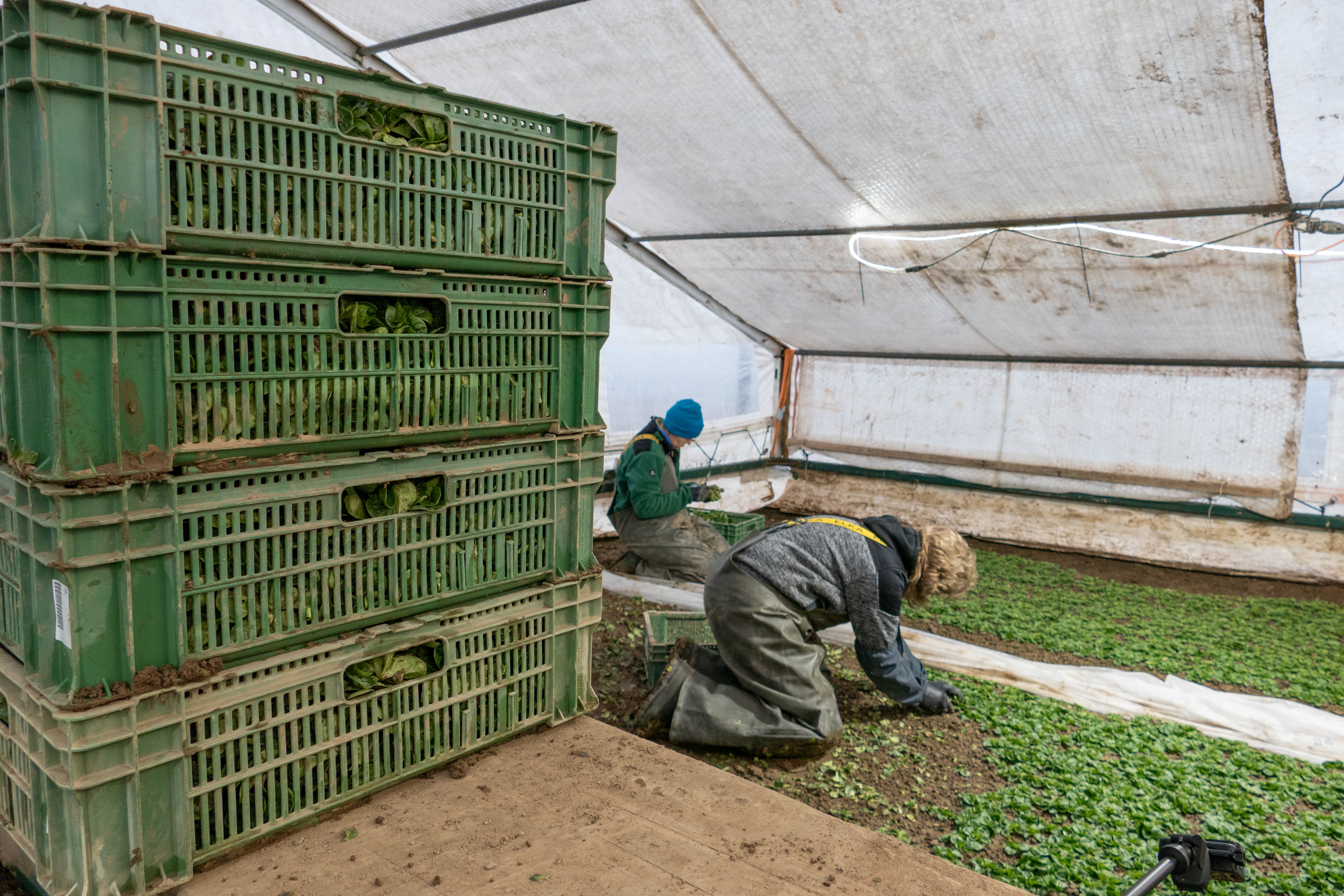 Ganz anders der Nüsslisalat auf dem Freiland: «Unsere einzeln ausgesäten Pflanzen tanken direktes Sonnenlicht, trotzen widrigen Temperaturen oder auch dem Schnee», erklärt Thomas Käser. Sie bilden eine Rosette mit festen, saftig grünen Blättern. Der Nüsslisalat kommt bei der Kundschaft an. Doch der Aufwand, den er dafür betreiben muss, ist beträchtlich und hat seinen Preis. Die Produktion besteht aus einem komplexen System aus Anbautechnik, Pflege, Ernte und Vermarktung. Er blickt zu den auf Knien erntenden Mitarbeitenden neben ihm: «Diese harte Arbeit soll bei uns anständig und fair entlohnt werden!»
