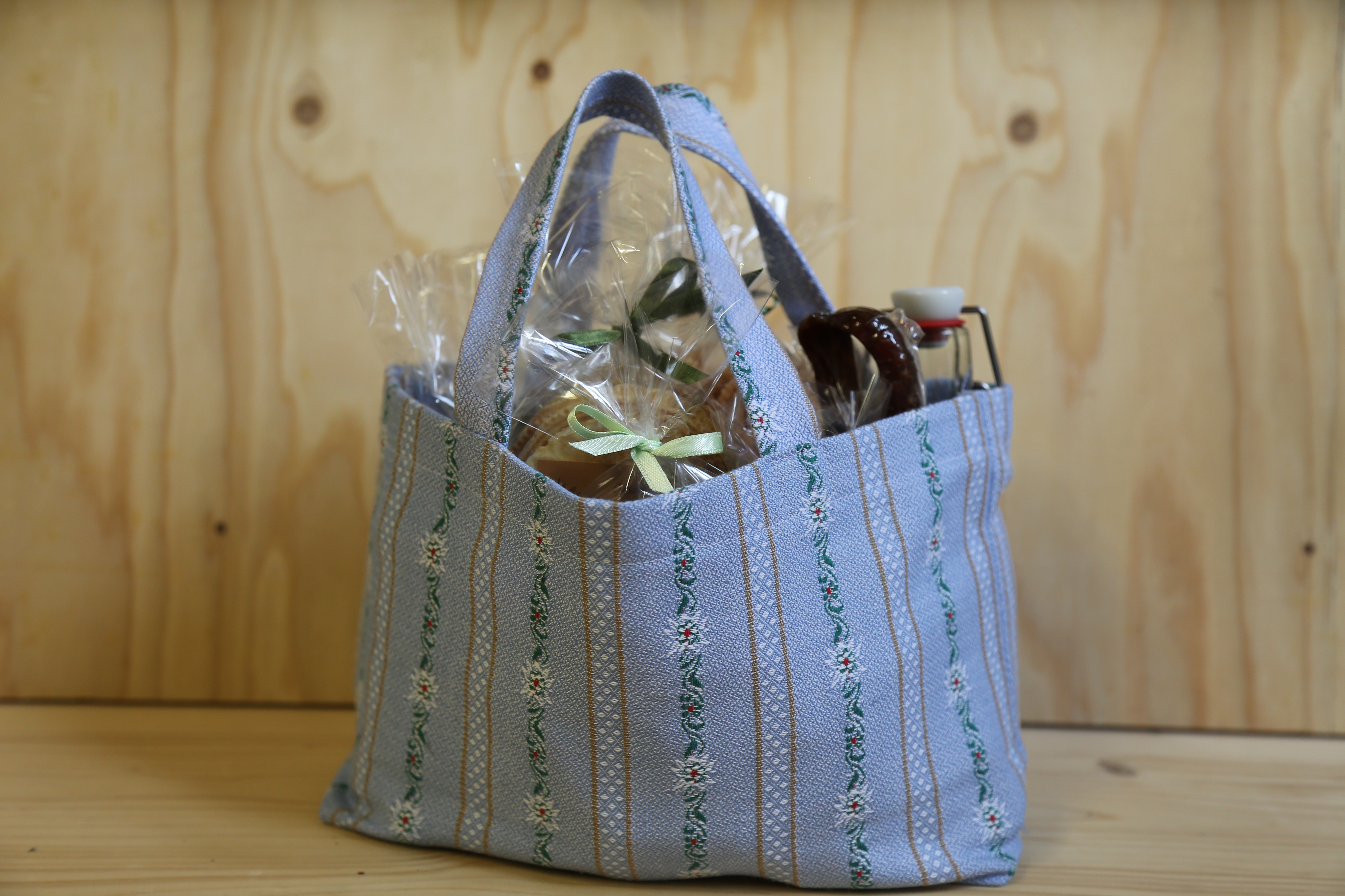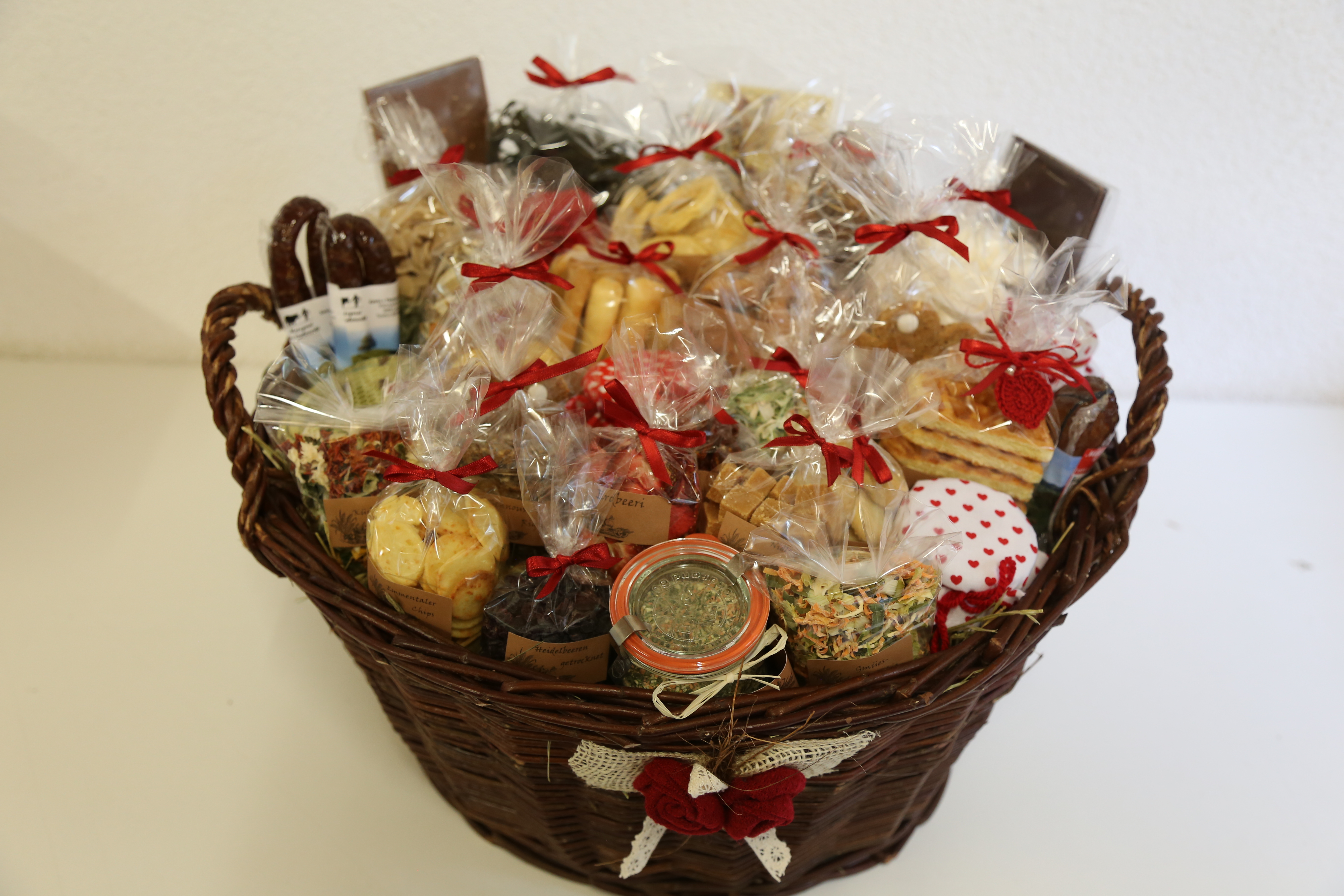 Die Geschenkkörbe werden mit viel Bedacht individuell gestaltet. So werden die Geschenke auch sehr persönlich, meint Margrit Gerber, und zeigt dabei auf einen grossen Weidenkorb, der für eine Hochzeit zur Abholung bereitsteht. Der Stoff auf den Konfitürengläser hat rote Herzchen drauf und kleine gehäkelte Herzen baumeln an Zellophan-Tüten.