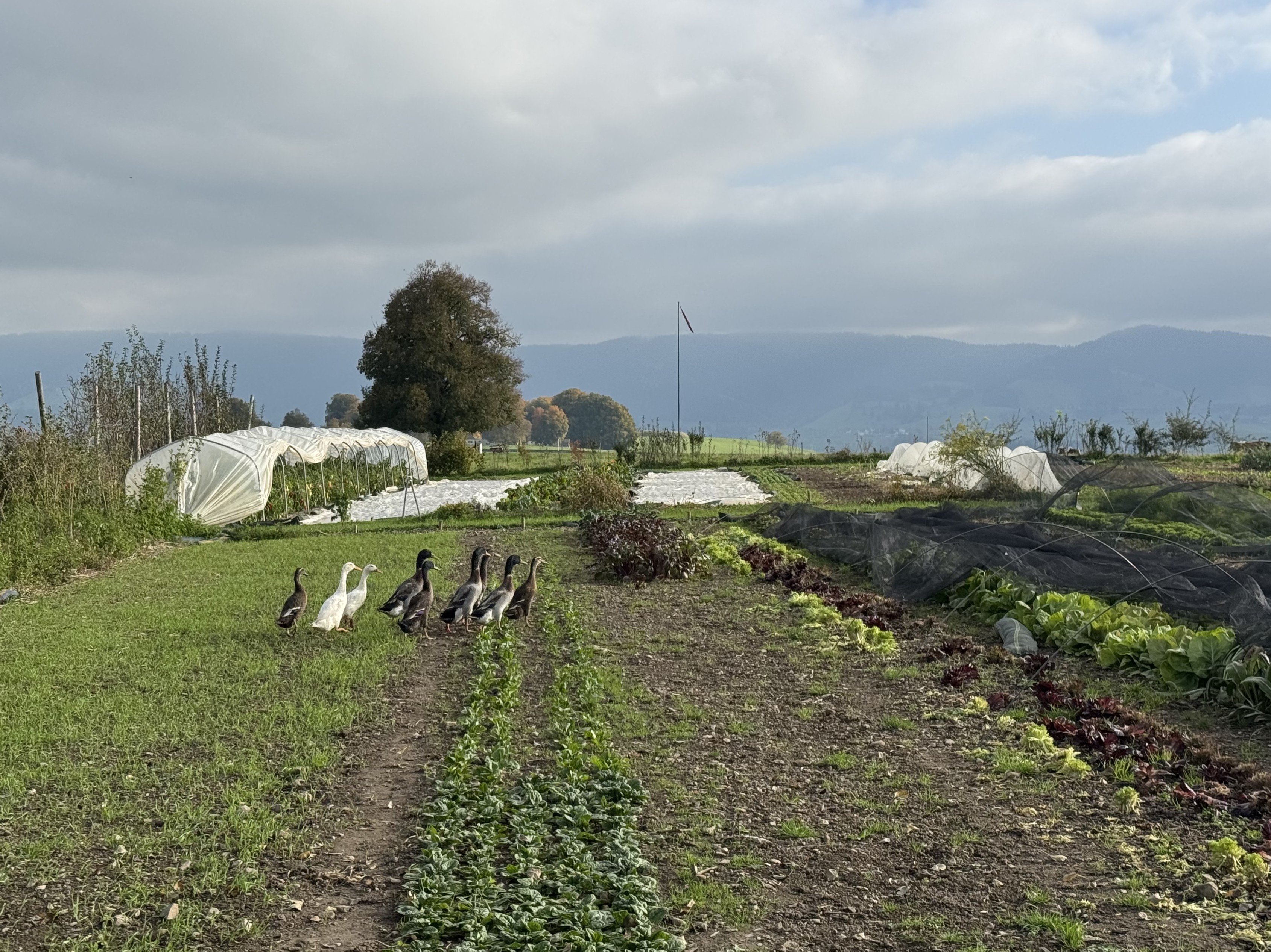 Ergänzt wird dieses System unter anderem durch Strukturen wie Asthaufen, die Nützlingen wie Igeln Unterschlupf bieten und durch Laufenten. Aber auch hier nimmt Regina Schwarzenbach einen Trade-off in Kauf: Denn die Laufenten mögen nicht nur die Schnecken, die sie vom Gemüse fernhalten sollen, sondern zum Teil auch Kulturen, die im Garten wachsen. Der Schaden einer Schneckenplage wäre aber weitaus grösser, deshalb opfert die Betrieblseiterin ab und an ein paar Salatblätter für die Enten und hält ihr System so in der Balance.