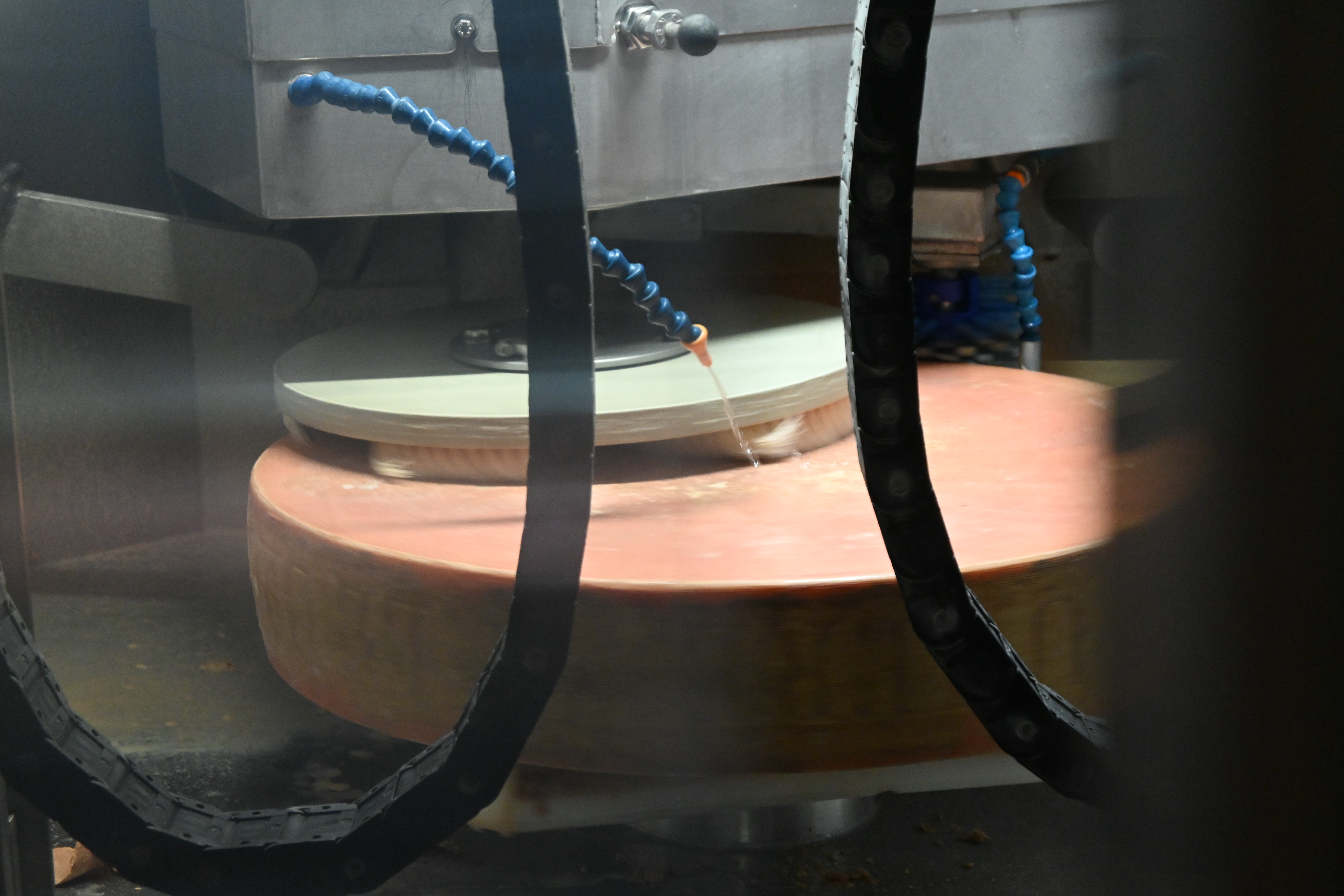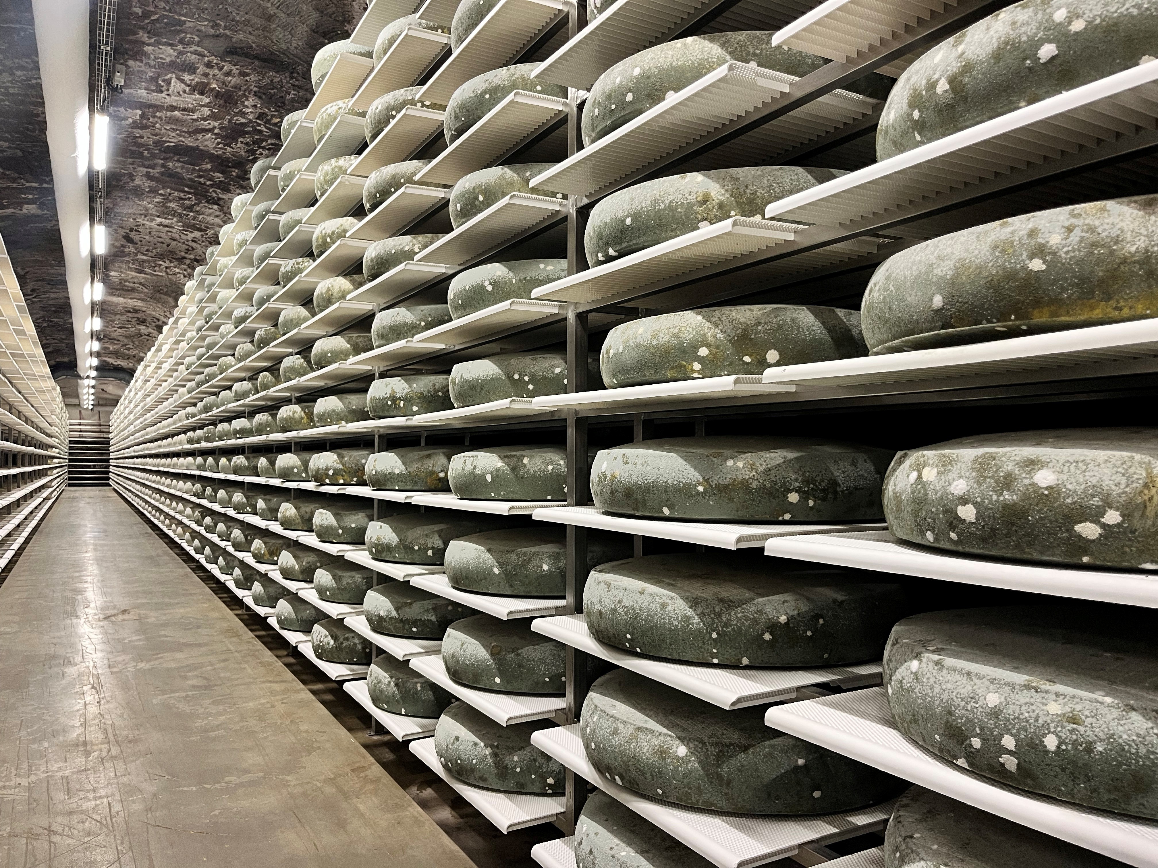 Was mit einem Gang angefangen hat, ist heute zu einem 2,3 Kilometer langen Netzwerk angewachsen, in dem man sich verirren könnte. Aus diesem Grund sind die Gänge mit Schweizer Kantonen beschriftet und es hängen überall Pläne in der Höhle. Bei voller Belegung liegen 150’000 Käselaibe auf den Regalen. Je nach Käsesorte müssen die Laibe unterschiedlich oft gepflegt und gewendet werden. Schon seit vielen Jahren werden dabei die Höhlenmeister mit Maschinen unterstützt.