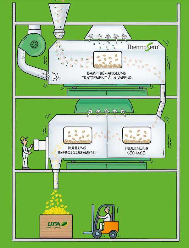 Heissdampf: Wenn Warmwasser nicht geht wie beispielseise bei Basilikum, Rucola oder Kresse, dann wird Saatgut zuerst befeuchtet und dann erhitzt. Der Wasserdampf tötet die Pilzsporen ab. Diese Methode nutzt auch das Fenaco Unternehmen «UFA-Samen» mit der Thermosem-Anlage. Sie behandelt 15 Tonnen Getreide pro Stunde. Diese Methode ist weniger energieaufwändig und hat eine höhere Leistung.
