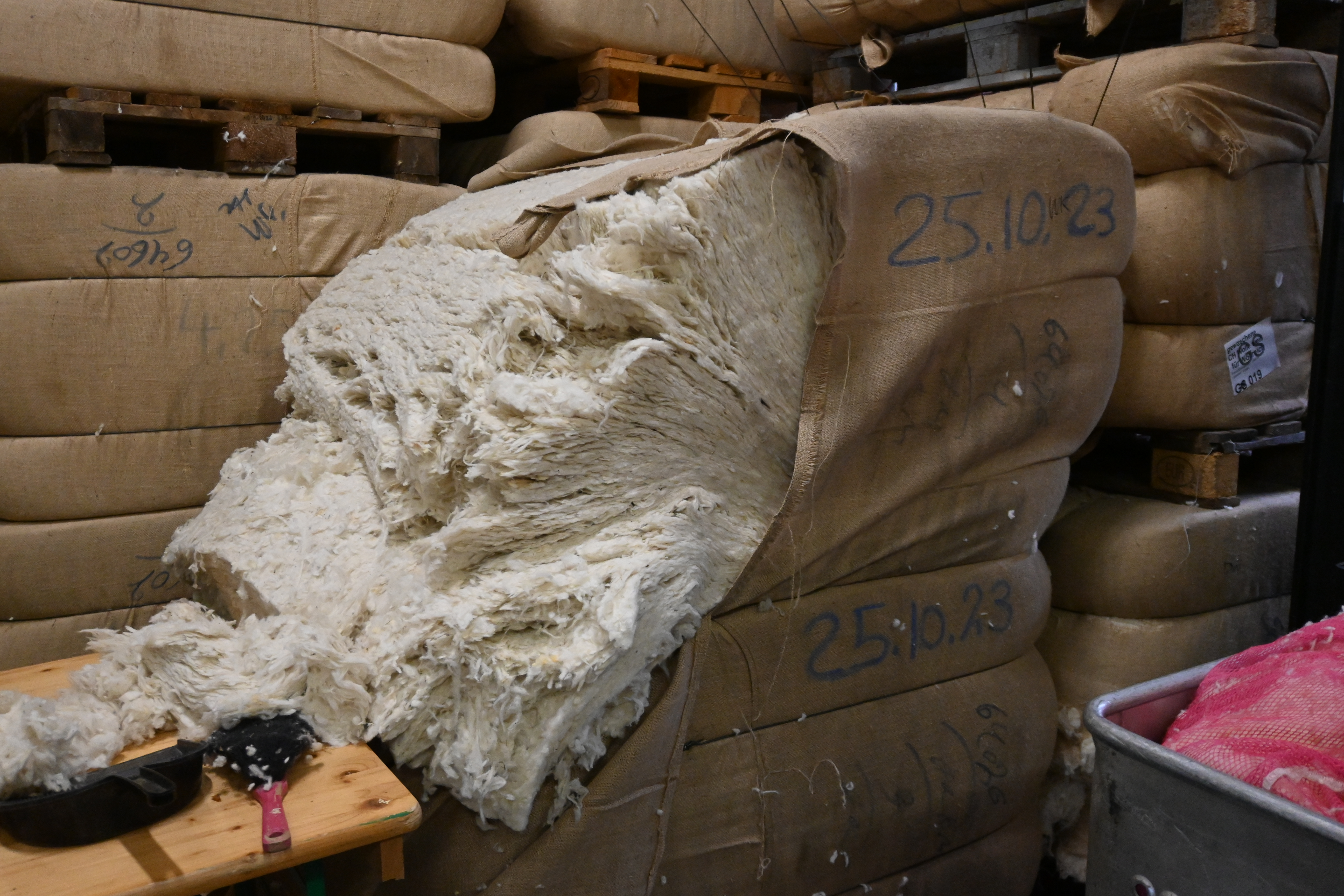 Familie Brog verarbeitet sowohl eigene Wolle als auch Wolle von anderen Schafen aus der Schweiz. Diese wird nach dem Waschen in grossen Ballen in Meiringen angeliefert.