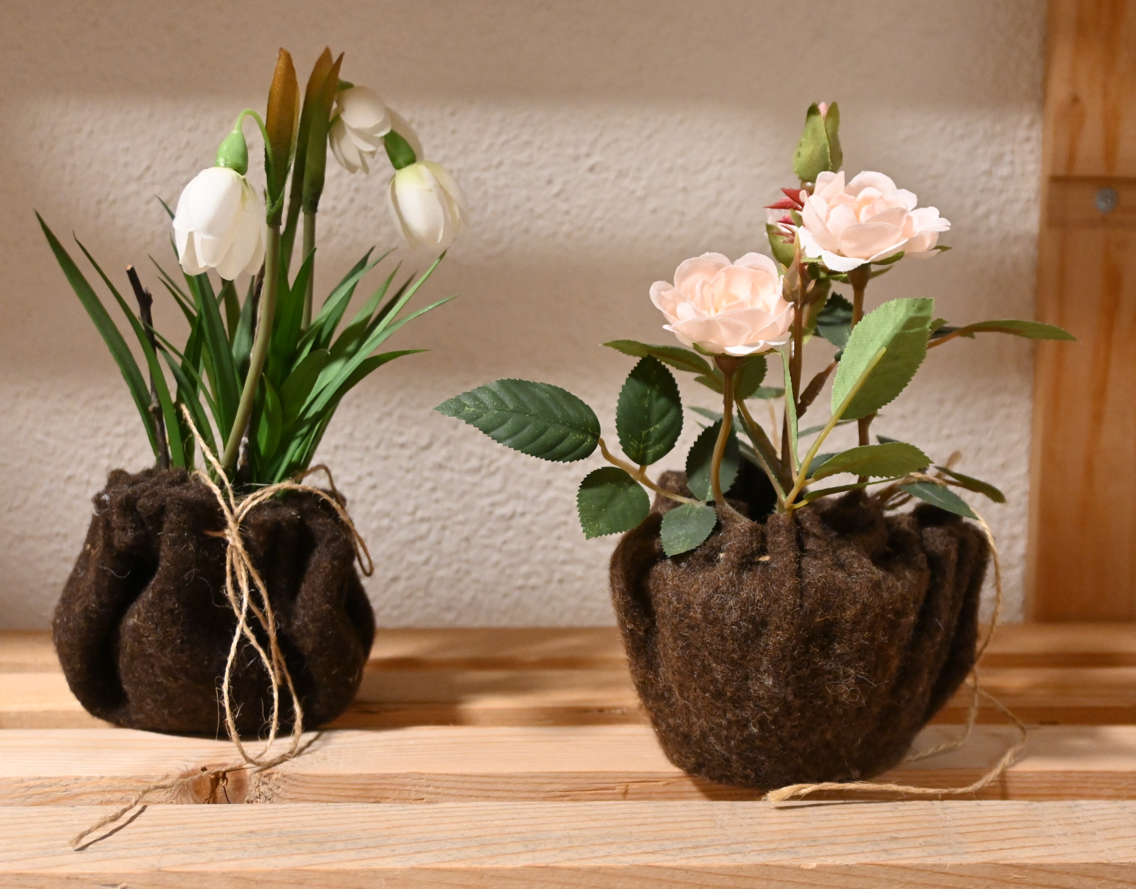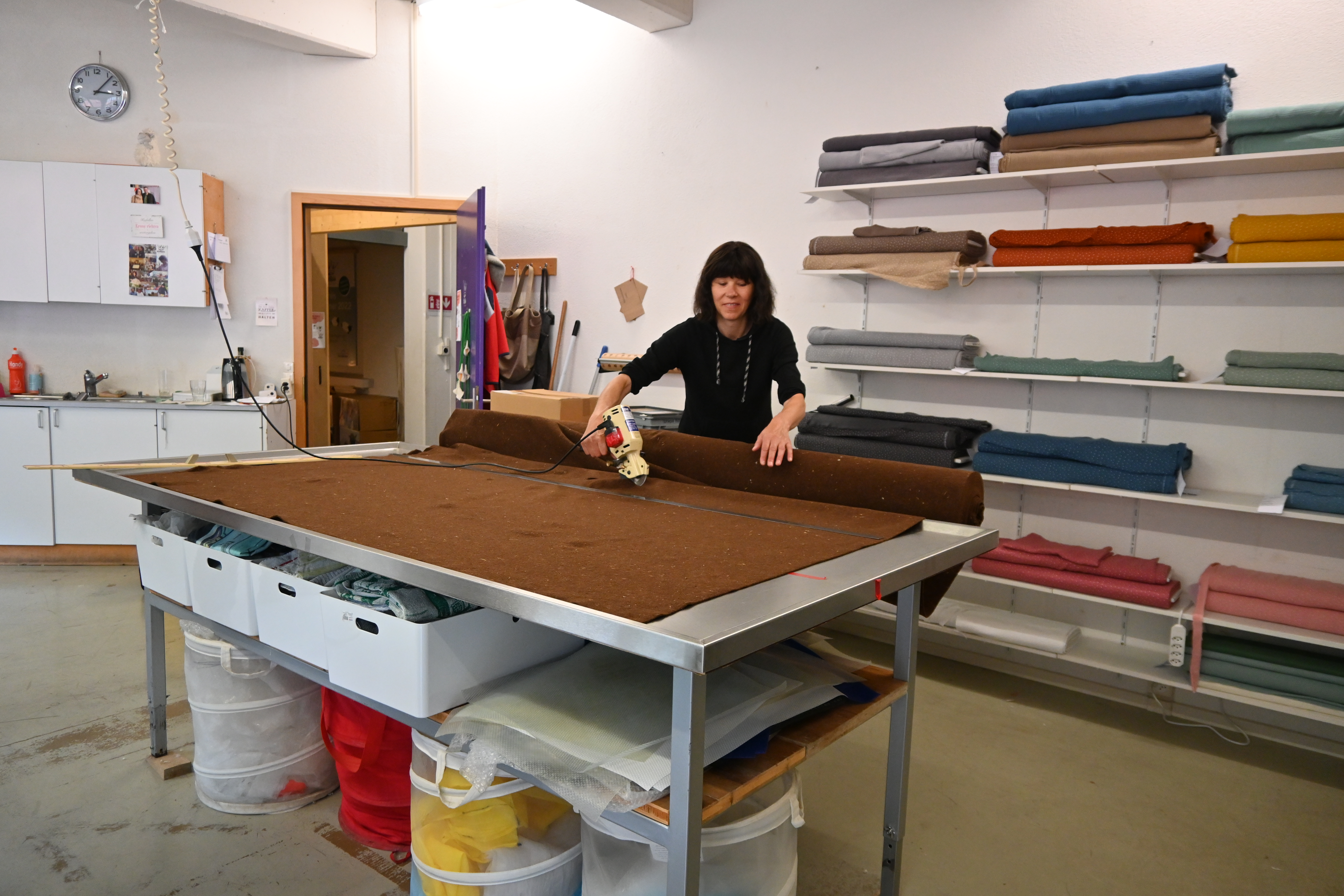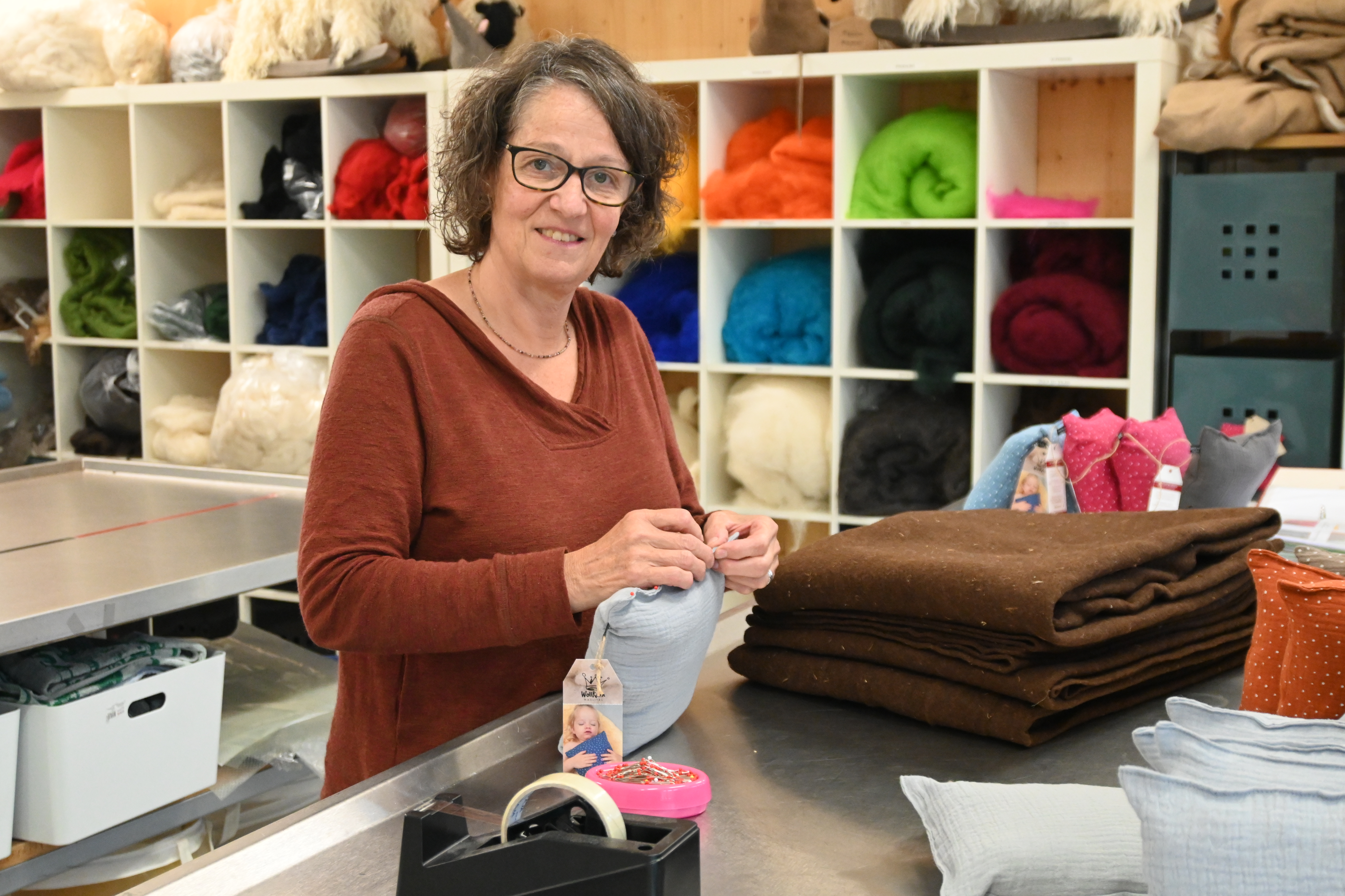 Auf dem Arbeitstisch im Atelier vom Wollreich schneidet Therese Schmid, ebenfalls Mitarbeiterin der ersten Stunde, ein grosses braunes Wollvlies zu. Es hat noch Strohstücke drin. «Das zeigt, dass Wolle ein Naturprodukt ist», erklärt sie. Das Vlies wird aus Restwolle hergestellt. Es ist für den Einsatz im Garten oder als Blumentopf gedacht. Schafwolle hat gute Isolations-Eigenschaften und kann auch Wasser gut speichern. Zudem dient es als Windschutz.