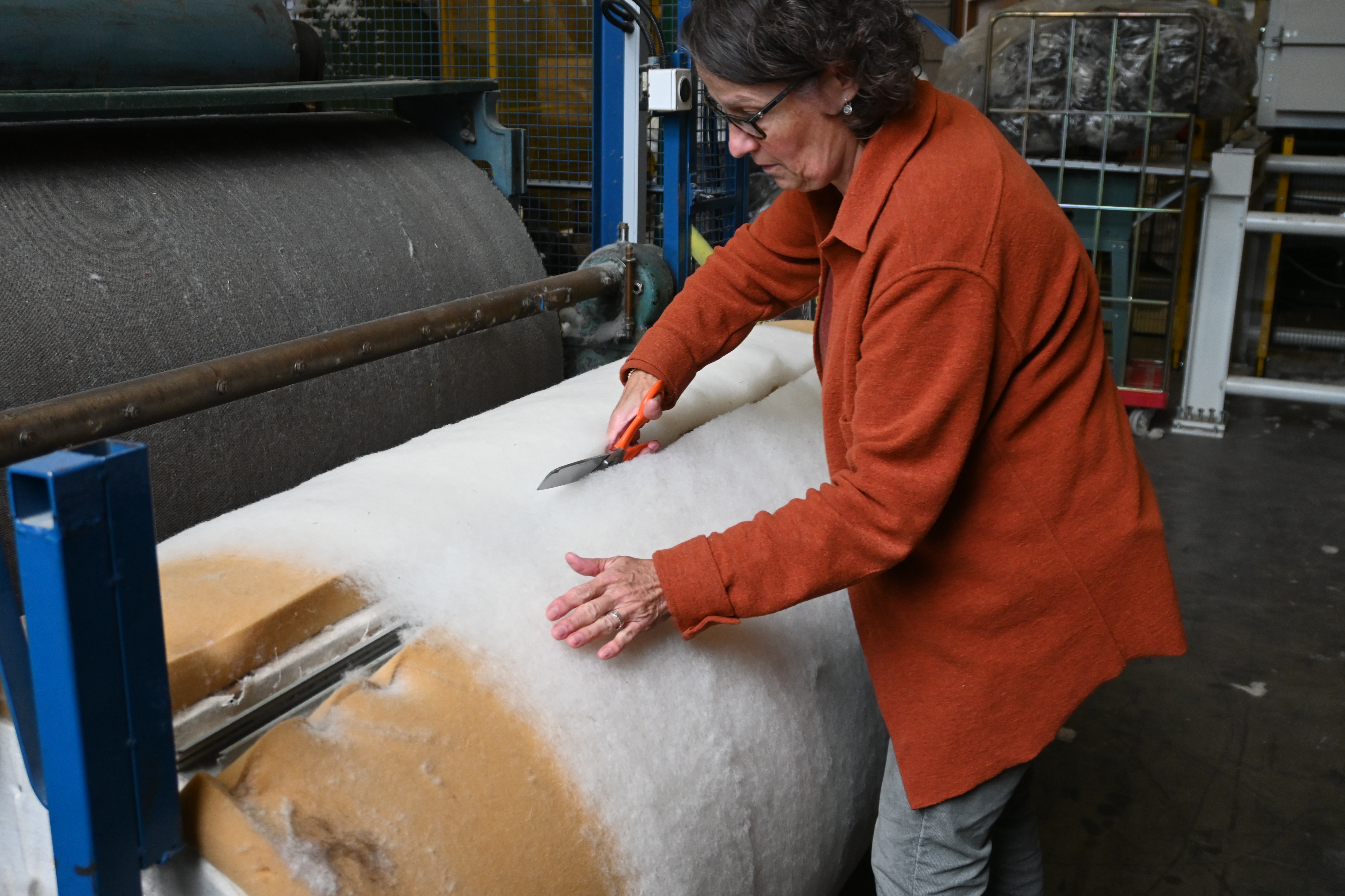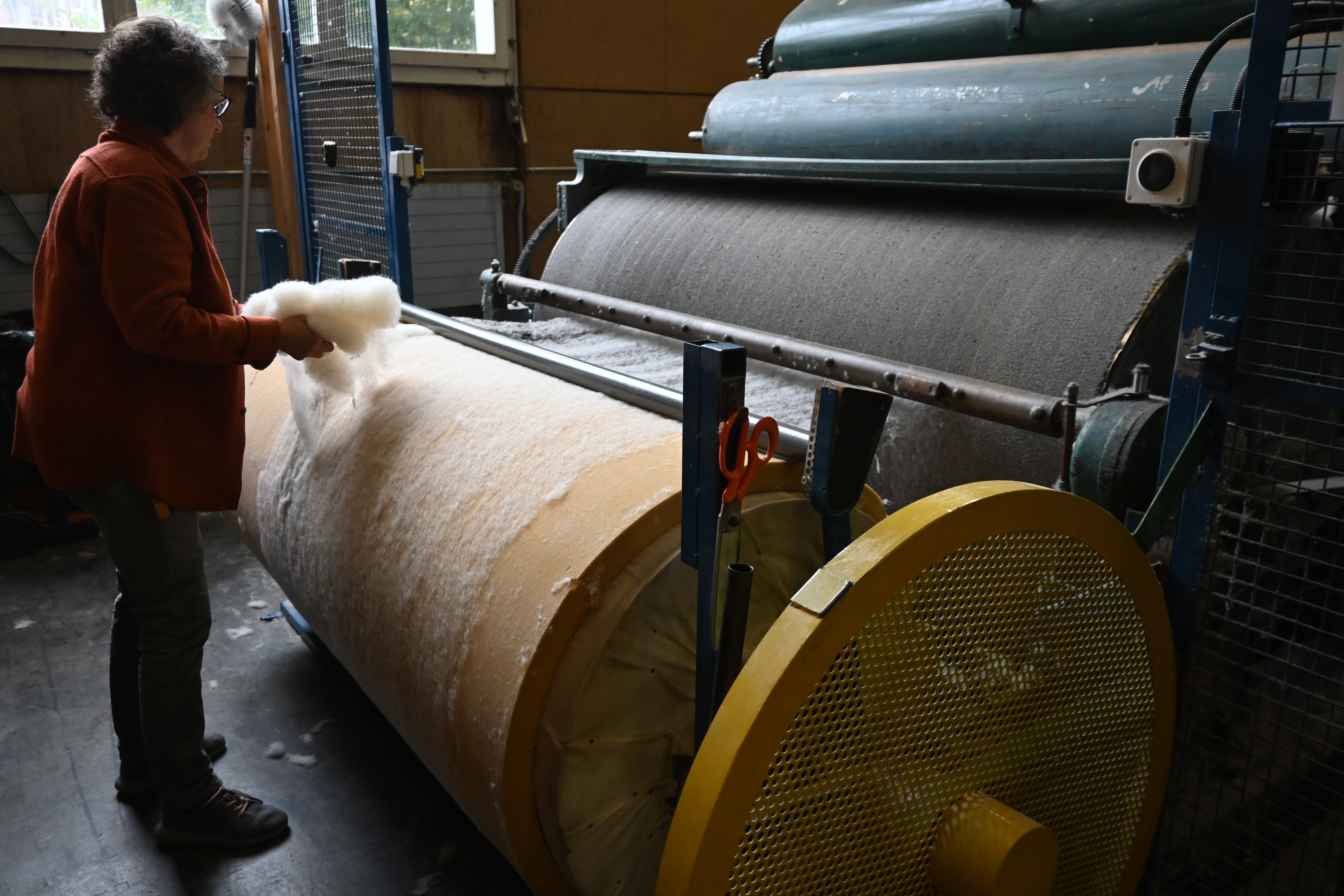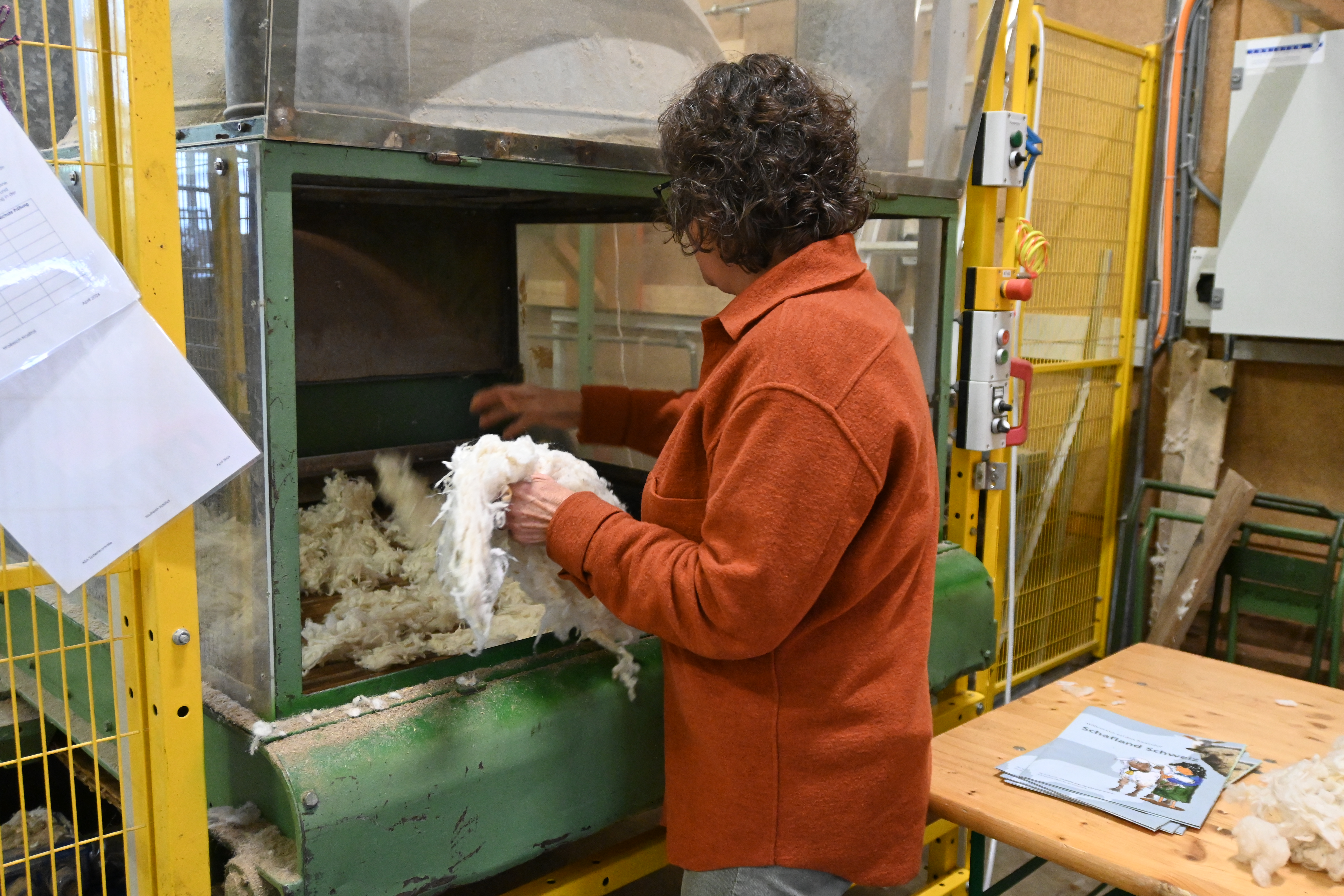 Die Produktionshalle ist Heinz Brogs Reich. Hier verarbeitet er die Wolle weiter zu Vliess oder Kügelchen. Manchmal hilft ihm auch Caro Nägeli, Mitarbeiterin seit der ersten Stunde oder eine andere Helferin.