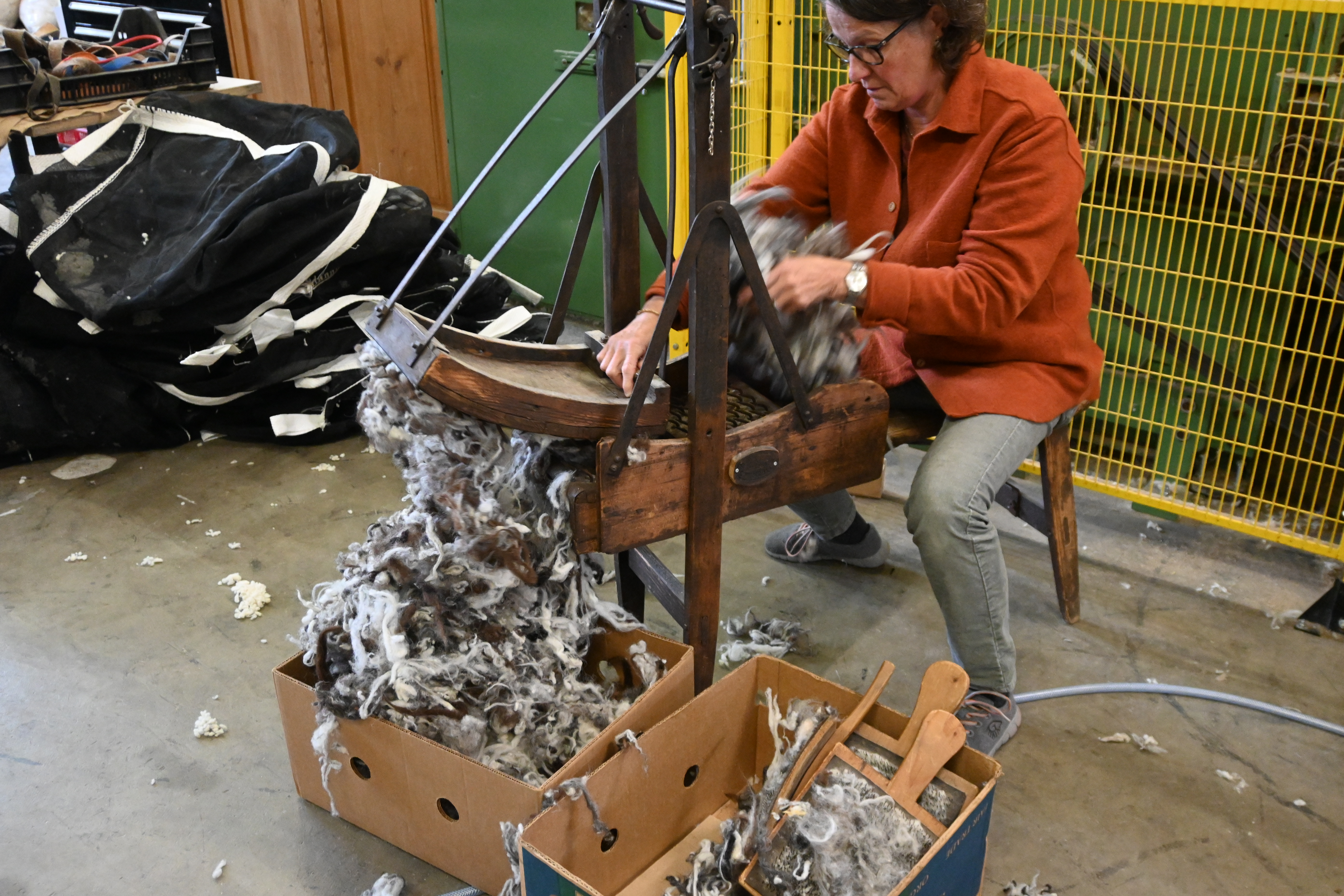 In einem ersten Schritt gibt er die Wolle von Hand in den Reisswolf. Dieser lockert die Wolle auf und reisst sie auseinander. Dadurch fallen letzte Strohstücke oder andere Verunreinigungen heraus.