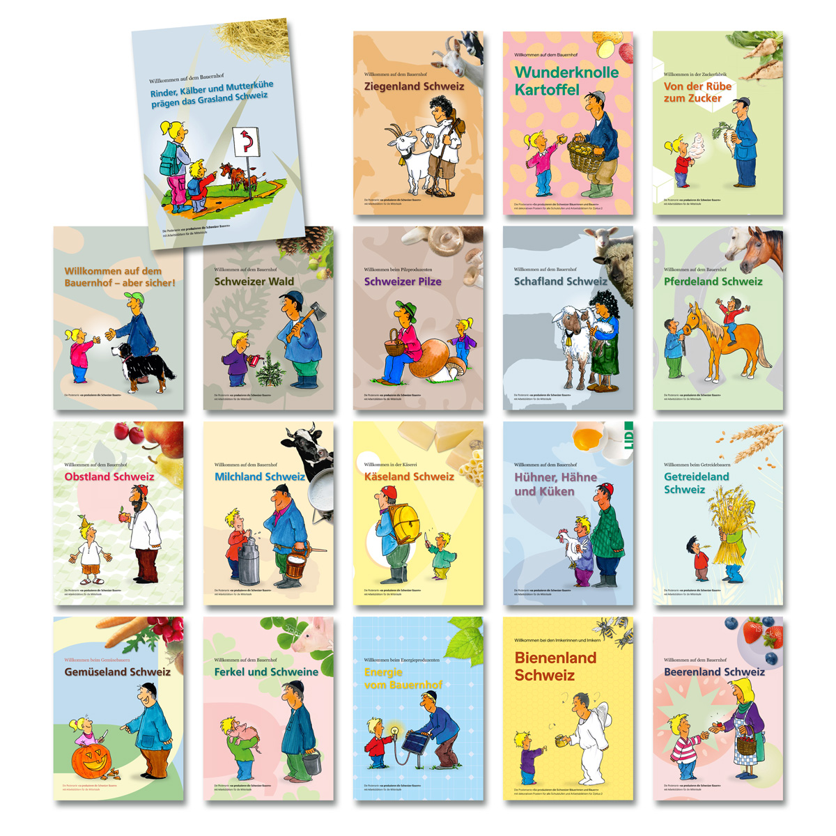 Jedes Poster im Format A1 zeigt einen Schweizer Landwirtschaftsbetrieb in gepflegter Kulturlandschaft. Darum herum ist der Weg eines Lebensmittels vom Acker bis zu den Konsumentinnen und Konsumenten dargestellt.