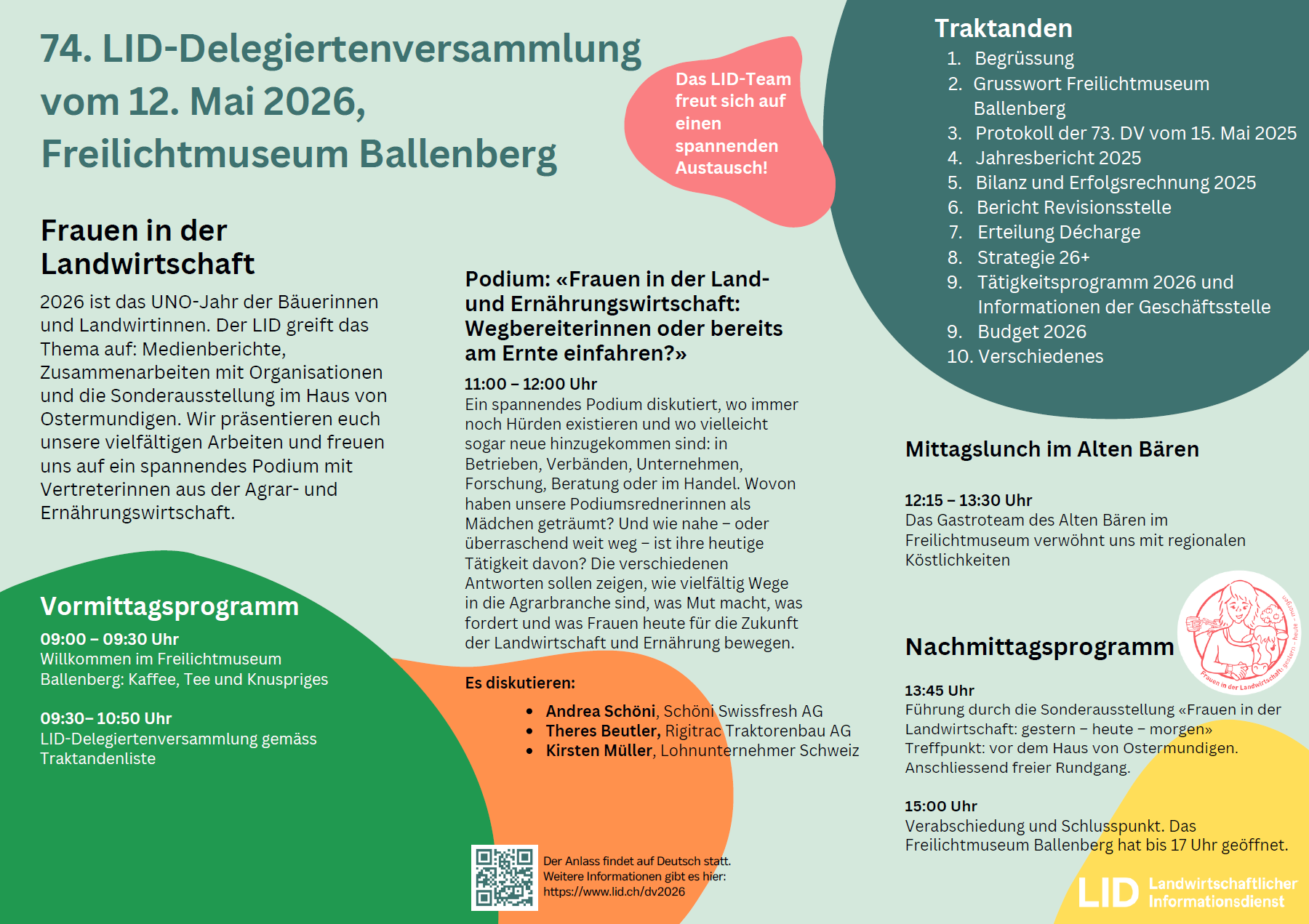 2026 ist das UNO-Jahr der Bäuerinnen und Landwirtinnen. Der LID greift das Thema auf: Medienberichte, Zusammenarbeit mit Organisationen und die Sonderausstellung im Haus von Ostermundigen. Wir präsentieren zudem die neue LID-Strategie 2026+ und freuen uns auf ein spannendes Podium mit Vertreterinnen aus der Agrar- und Ernährungswirtschaft. Dies alles im Freilichtmuseum Ballenberg am 12. Mai 2026.